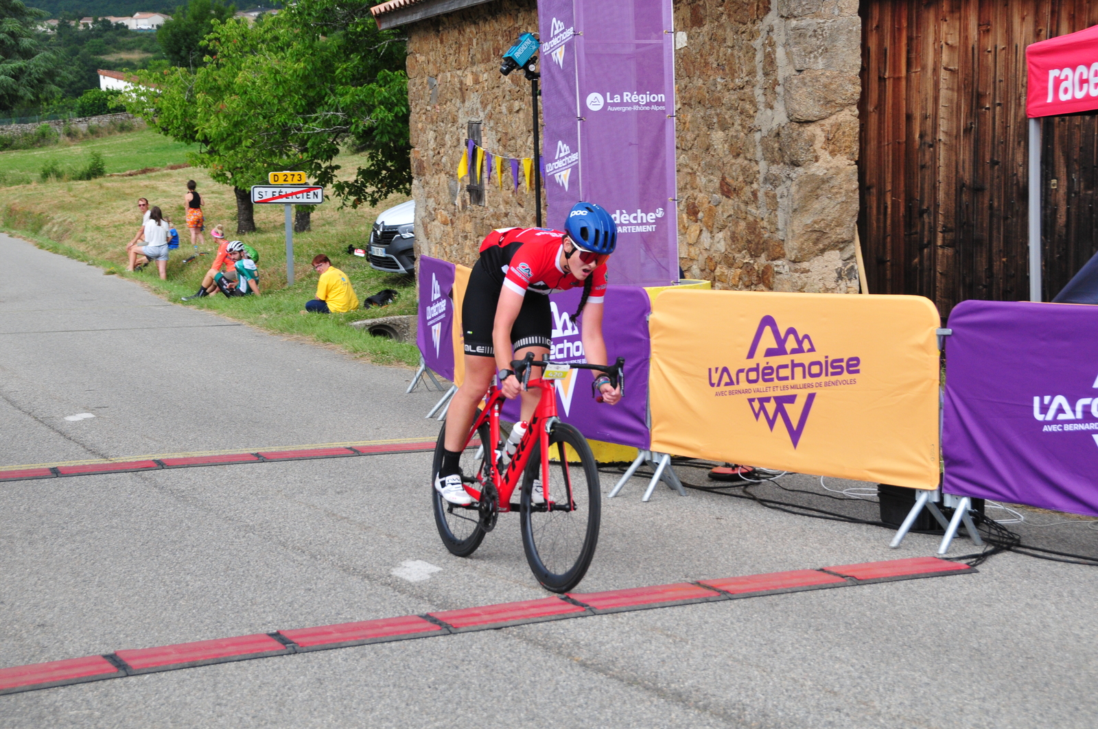 Comme tous les ans depuis 10 ans, Camille a participé à l’une des courses de l’Ardéchoise, organisée au départ de Saint-Félicien du 11 au 15 juin. Finie l’Ardéchoise des jeunes le mercredi ! Après avoir remporté le scratch féminin du parcours de 125 km en 2022 et 2023, Camille a pris le départ des Boutières (135 Km 2400m D+) dimanche, support pour la 2e année consécutive du championnat d’Europe UEC de medio fondo. Une cinquantaine de coureuses venues de France, d’Allemagne, de Belgique, d’Espagne, d’Italie, de Suisse et d’Irlande se sont élancées avec leurs homologues masculins pour gravir les cols du Buisson, de Nonières, de Rochepaule, de Clavières, de Freydaparet et du Rouvey avant de redescendre vers Lalouvesc puis Saint-Félicien via le col du Faux et Pailharès.
