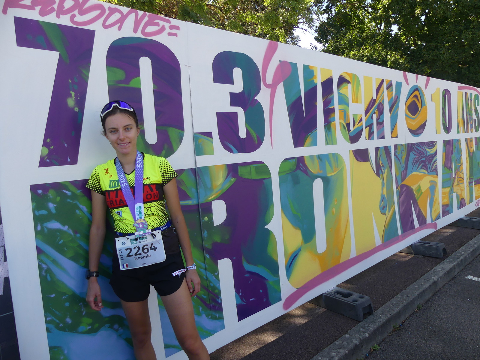 Très tôt ce dimanche 24 août matin, notre jeune Noémie ROUBY s’est alignée sur la 10ème édition du half Ironman de Vichy (2 km de natation + 90 km de vélo avec 1000 m de dénivelé + 21 km de course à pied) dans le département de l’Allier. Après une natation dans la rivière et un départ plongé en rolling-start, Noémie a réalisé le parcours vélo vallonné avant de s’élancer sur le semi-marathon en 2 boucles le long des berges de l’Allier sous les encouragements du public venu nombreux !