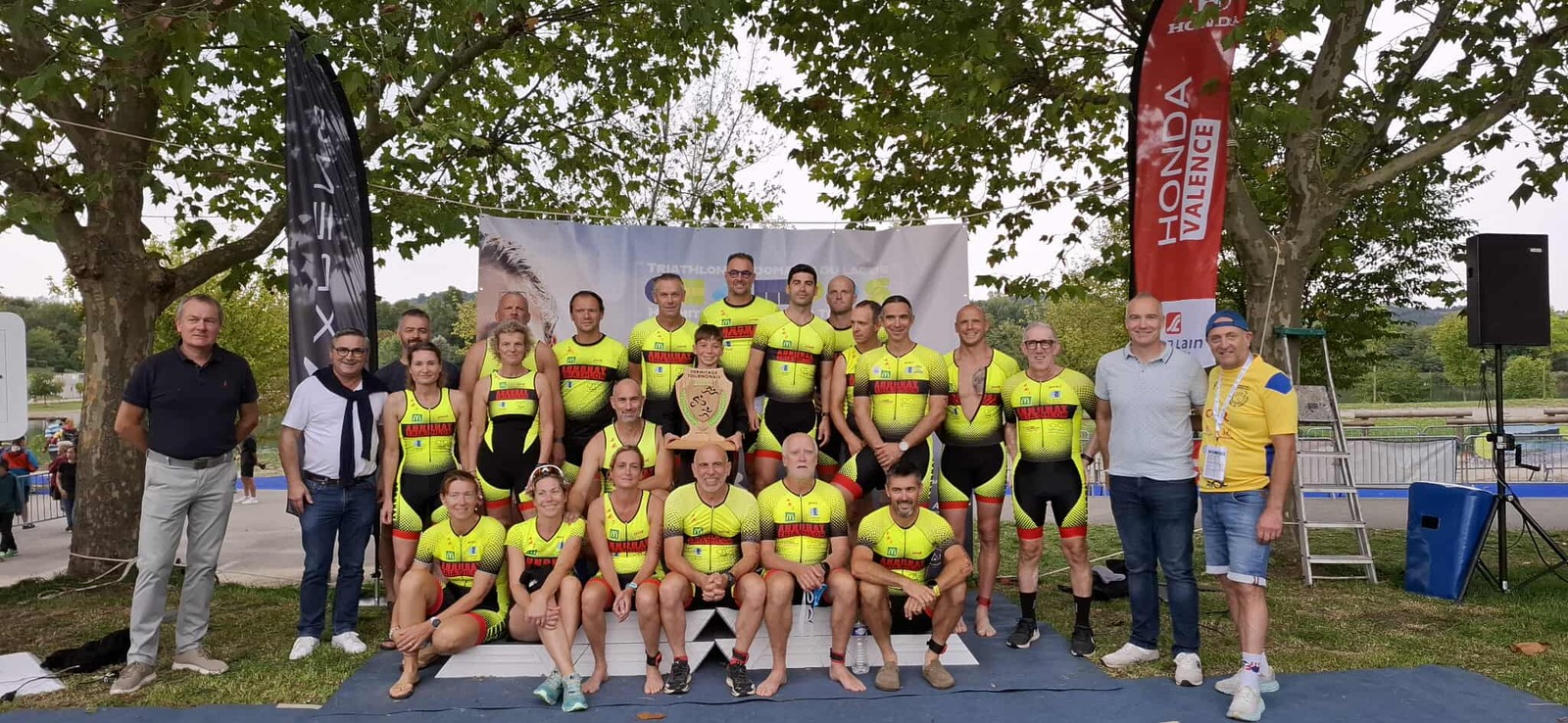 C’est sous la pluie qu’une grosse délégation constituée d’une trentaine de sportifs, s’est présentée sur les différents formats du triathlon du lac de Champos organisé par le club de triathlon de l’Hermitage tournonais à St-Donat-sur-l ‘Herbasse dans la Drôme.