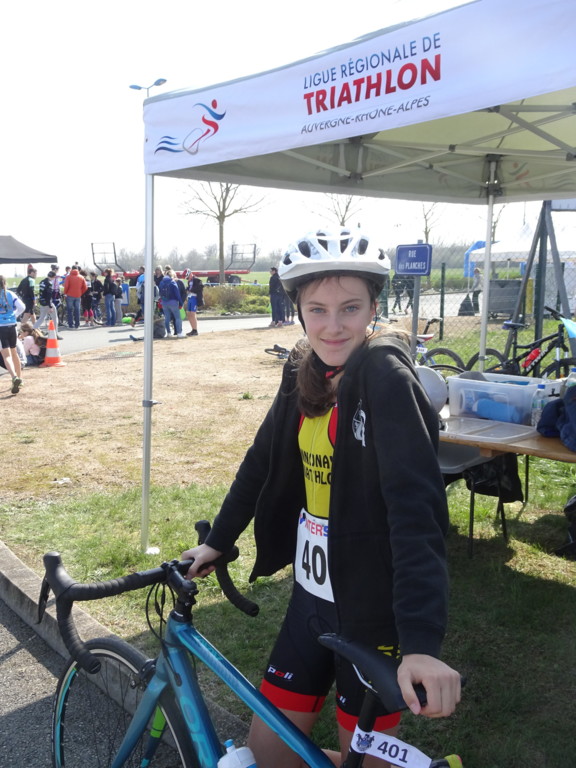 Ce dimanche 24 mars avait lieu le duathlon sélectif championnat de France organisé par le club de triathlon de Vichy à Gannat. Dans la catégorie minime, avec le dossard 401, Noémie Rouby a réalisé le parcours de 2,9 kms en 11’30’’ lui permettant de s’engager avec les 10 premières filles sur l’épreuve en vélo de 10,5 kms. Malgré le peu d’expérience dans cette discipline et une chute 15 jours avant au duathlon de Craponne, Noémie limite au maximum la perte de temps. Sur la dernière partie de 1,2 kms de course à pied, elle fait l’effort de revenir sur plusieurs concurrentes lui permettant ainsi d’accrocher la 16ème place et de se qualifier in extremis pour le championnat de France de duathlon qui aura lieu le 14 avril prochain à Noyon près de Reims: BRAVO Noémie!!