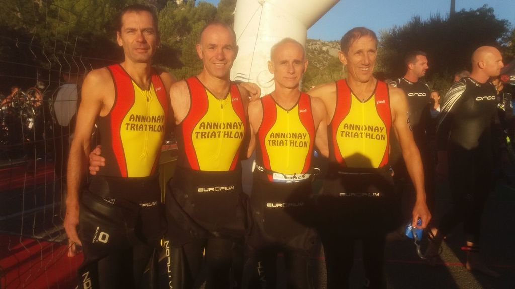 Ce dimanche à 9h plage du Bestouan de Cassis, 4 triathlètes clôturaient la saison tri. par le distance M organisé par les Sardines de Cassis. 1500 m de nat dans une eau à 15°6, ça pique un peu mais surtout beaucoup de vent et beaucoup de vagues. 43kms de vélo dans l'arrière pays avec une sortie du parc vélo idem à la côte barlet !!! ça calme et un 10kms à pied de malade (je monte je descends, je remonte je redescends etc....) Mohamed Mezgueldi finit 54ème en 2h45'05'' et 2ème V3, Fred Puaux est 80ème en 2h53'14'', Denis Combe termine 124ème en 3h00'17'' et Eric Combe pour son premier tri. boucle en 3h03'52'' à la 152ème place. Malgré la difficulté, c'est une épreuve dans un endroit paradisiaque avec une organisation 5 étoiles. A refaire.