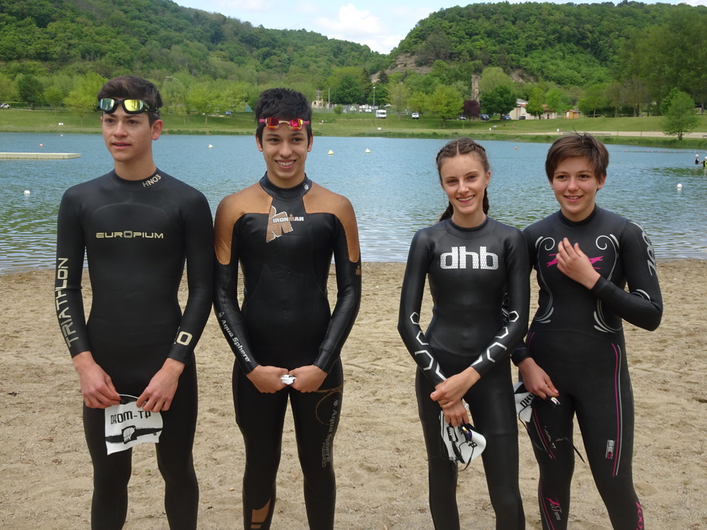 Malgré une météo automnale et une température de l’eau à seulement 16 degrés, 4 courageux jeunes triathlètes et 3 adultes se sont lancés ce samedi 04 mai sur le triathlon du Dauphiné au domaine de Champos à Saint Donat.