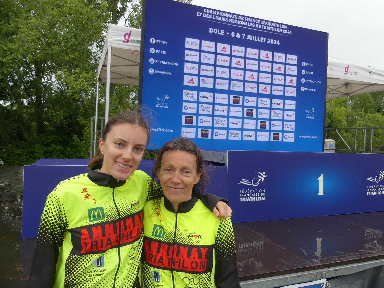 Après le Duathlon et le Triathlon, c’est l’aquathlon qui a décerné ses titres de champions de France ce samedi 06 juillet à Dole dans le Jura. Ce sont 866 concurrents qui ont participé à cette compétition organisée par Dole Triathlon. C’est sous une pluie battante et des températures automnales que nos 2 jeunes présélectionnes ont pris le départ de la natation main sur le ponton dans la rivière du Doubs.