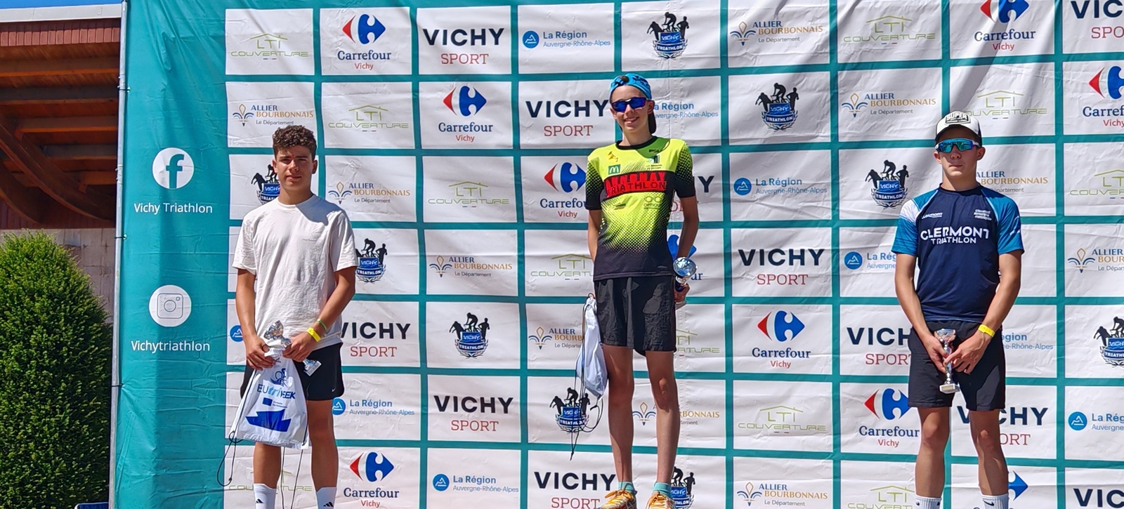 Sur le format XS (400 m natation + 11 km vélo + 2,3 km course à pied) Thibault monte sur la plus haute marche du podium en remportant la course en 39’07’’
