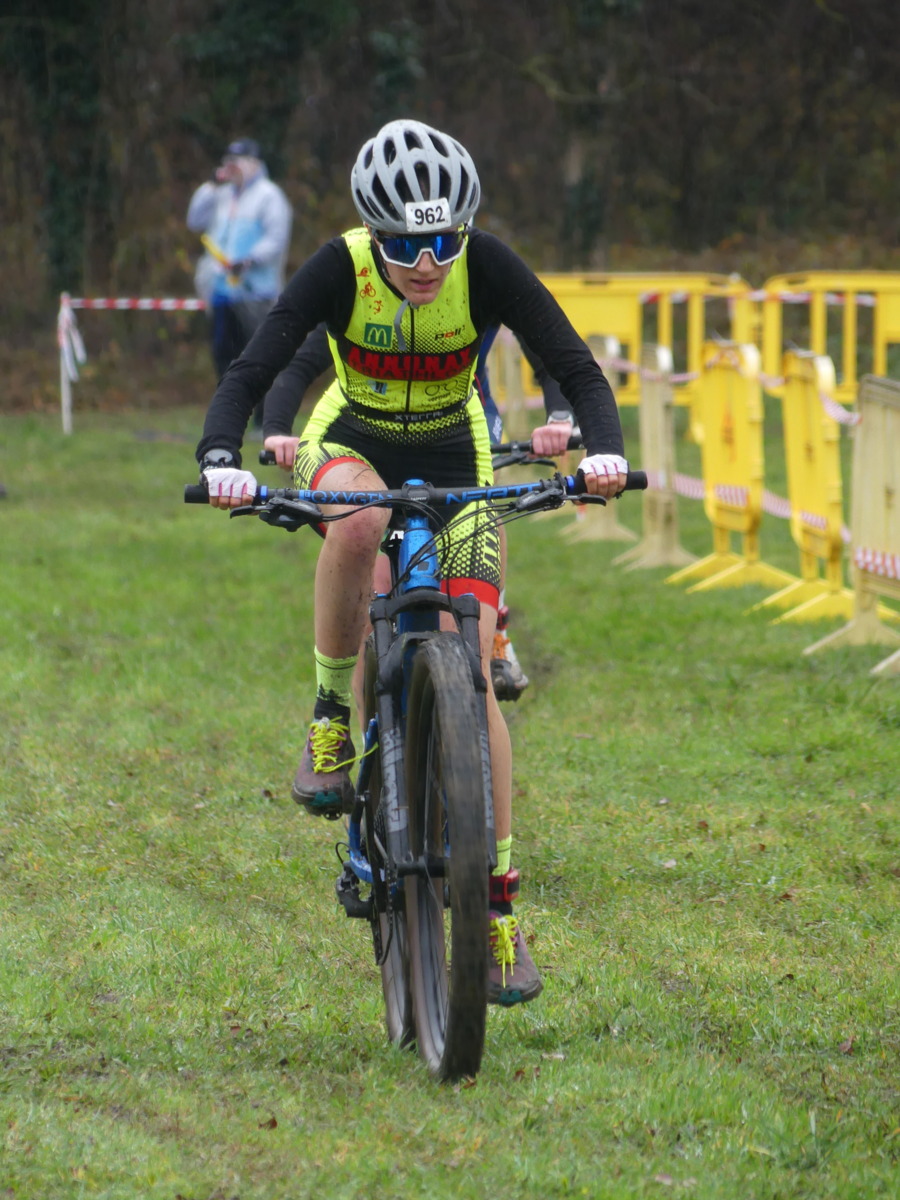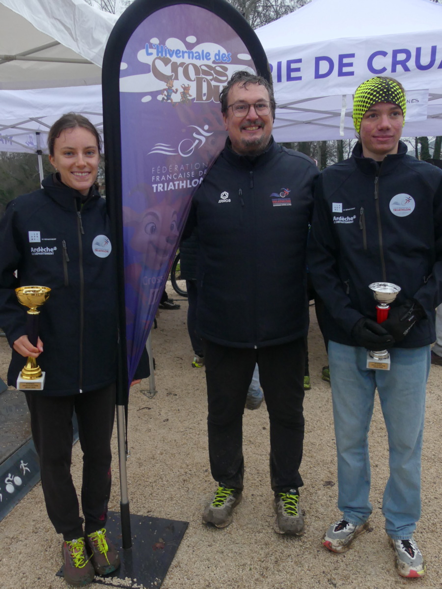 Les clubs de triathlon de Cruas et de Privas ont coorganisé le cross duathlon de ce samedi 17 janvier sous une météo pluvieuse ayant rendu des conditions difficiles et un sol extrêmement boueux et glissant pour les sportifs. C’est sous un déluge que les plus jeunes se sont élancés dès le matin. Sur la course 9-11 ans et un parcours de 500 m course à pied + 2 km VTT + 500 m course à pied, c’est Adèle CROIZIER chez les filles qui remporte la victoire en 12’13’’ et s’offre également le titre de championne départementale de l’Ardèche. Sur le format XS (2 km course à pied + 5,5 km VTT + 1 km course à pied), c’est le jeune Maxence BOGIRAUD en 19’46’’ dans la catégorie minime qui s’octroie une nouvelle 1ère marche sur le podium et qui décroche aussi un nouveau titre de champion départemental ! Enfin, sur la distance S (4 km course à pied + 11 km de VTT + 2 km de course à pied) chez les féminines saluons la jolie 3ème place de Noémie ROUBY chez les seniors en 47’06’’qui lui permet, à elle également, de remporter le titre de championne départementale !